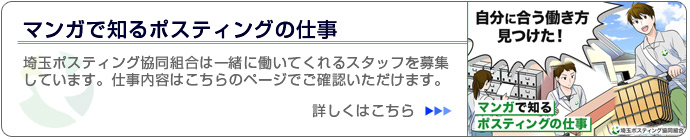 埼玉ポスティング協同組合は皆さまが安心してポスティングをご利用いただけるよう、厳しい規定をクリアしたポスティング会社のみが加盟する組合です。「埼玉ポスティング協同組合加盟社なら安心」そう言っていただけるよう、今後も常に身内に厳しく、日々精進を重ねて行くことをお約束いたします。