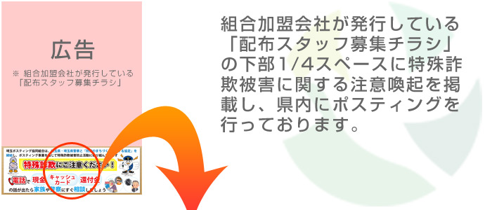 主な取り組みとして、組合加盟会社が発行している「配布スタッフ募集チラシ」に、特殊詐欺被害に関する注意喚起を掲載し、県内にポスティングを行っております。
